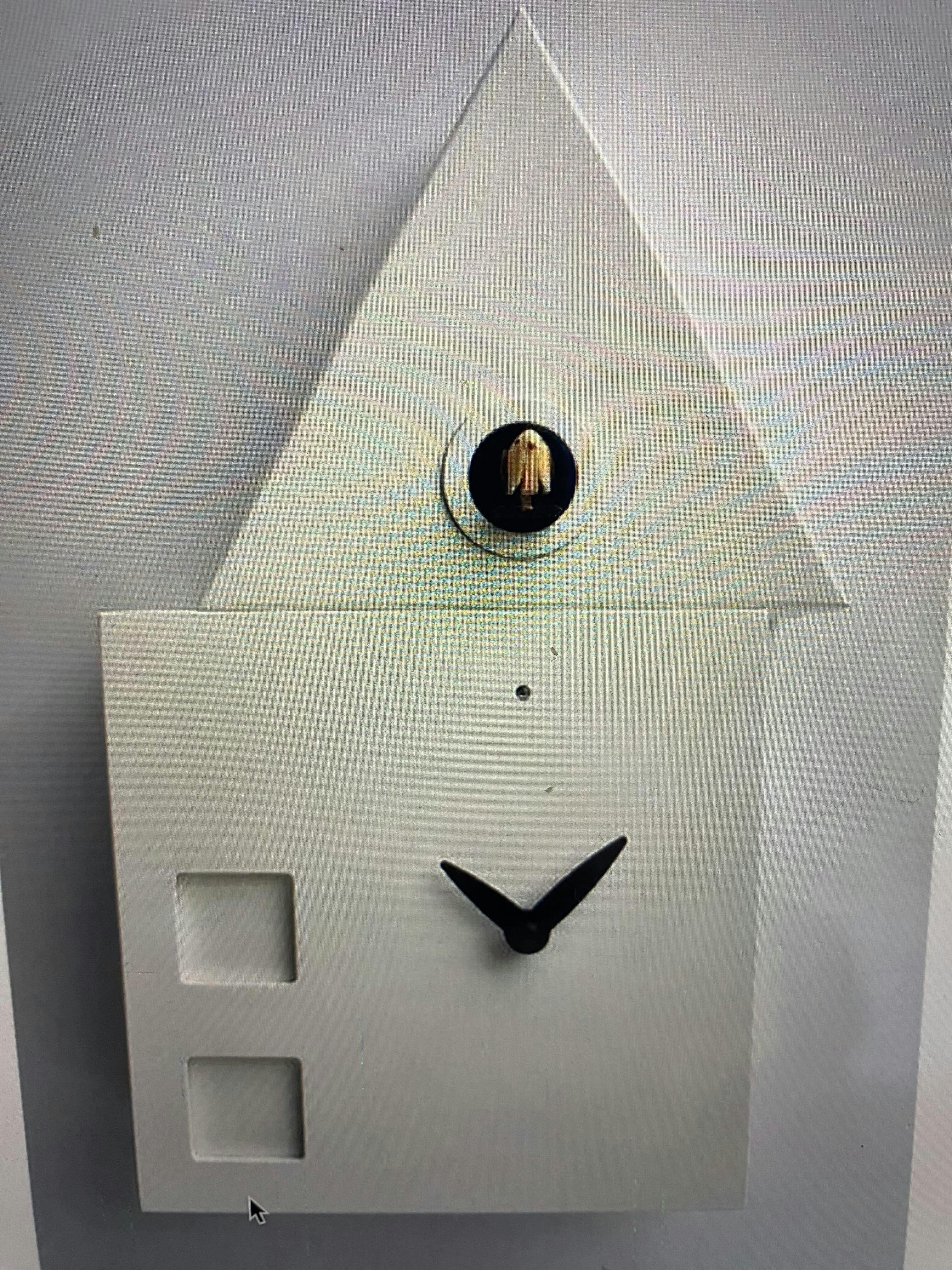 A house cuckoo with an unusual shape making it fun and able to adapt to any environment. Composed of two floors of different heights, its peculiarity is the roof where the cuckoo is placed which is not aligned with the lower floor.